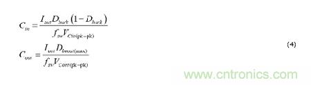 在圖4中,步驟4和5是指分別由降壓和升壓工作模式設(shè)定的輸入和輸出電容值。高密度設(shè)計(jì)越來越多地將數(shù)個(gè)X5R-或X7R-介質(zhì)陶瓷元件組合在一起,有時(shí)還附帶著一個(gè)小尺寸電解電容器來實(shí)現(xiàn)大批量儲能功能。方程式4使用針對峰值到峰值的紋波電壓,在假定沒有等效串聯(lián)電阻 (ESR) 紋波分量的情況下設(shè)定基線電容估計(jì)值。