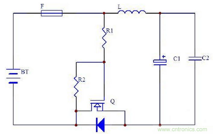 當(dāng)電池極性接反時(shí),D會(huì)由于反偏而截至,Q也會(huì)由于GS反偏而截至,逆變器不能啟動(dòng)。這種防反接保護(hù)電路由于沒(méi)有采用機(jī)械觸點(diǎn)開關(guān)而具有比較長(zhǎng)的使用壽命,也不會(huì)像反并肖特基二極管組成的防反接保護(hù)電路那樣燒毀保險(xiǎn)絲F.因而得到廣泛應(yīng)用,缺點(diǎn)是MOS導(dǎo)通時(shí)具有一定的損耗。足夠暢通無(wú)阻地通過(guò)比較大的電流還保持比較低的損耗。