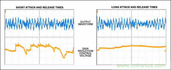 通過監(jiān)測增益衰減控制電壓和信號波形(圖3),可以觀察到較長和較短響應(yīng)、釋放時(shí)間的效果。為了產(chǎn)生有代表性的波形,輸入信號采用的是滿音量的音頻信號。在總體信號強(qiáng)度相對恒定的波形中,較短的響應(yīng)和釋放時(shí)間會(huì)導(dǎo)致頻繁的增益調(diào)整。而較長的響應(yīng)和釋放時(shí)間則維持平滑的增益響應(yīng),避免放大器響應(yīng)過快,從而在基本保留動(dòng)態(tài)范圍的同時(shí)維持整個(gè)信號的幅度。