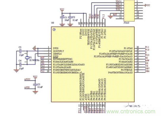 系統(tǒng)的主控電路圖如圖2所示。本系統(tǒng)中選用的MSP430F2274片內(nèi)有32Kb 閃存和1KbRAM,因此無須外擴存儲器。外接的32.768kHz 晶振作為CPU 關(guān)閉狀態(tài)Basic-TImer 的時鐘源,同時也作為系統(tǒng)的車載時鐘使用。