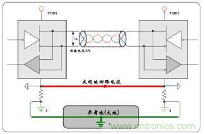 干擾不但影響信號,更嚴(yán)重的會導(dǎo)致板子死機(jī)或者燒毀,所以接口和電源的隔離是抗干擾的第一條“軍規(guī)”.隔離的主要目的是:避免地回流燒毀電路板和限制干擾的幅度,保護(hù)控制器不死機(jī)。如圖3所示,為未隔離時,兩個節(jié)點的地電位不一致,導(dǎo)致有回流電流,產(chǎn)生共模信號,CAN的抗共模干擾能力是-12~7V,超過這個差值則出現(xiàn)錯誤,如果共模差超過±36V,燒毀收發(fā)器或者電路板。