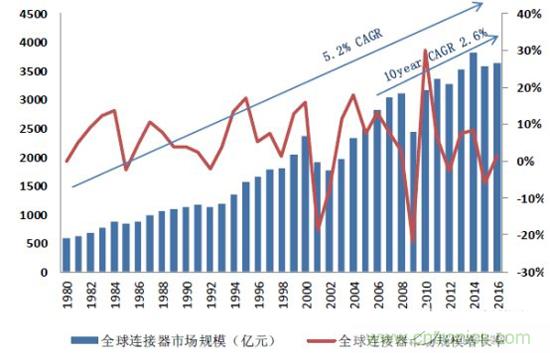 這是因?yàn)槿蜻B接器市場(chǎng)已經(jīng)連續(xù)近40年來(lái)持續(xù)增長(zhǎng),據(jù)Bishop&Associate數(shù)據(jù),全球連接器市場(chǎng)從1980年的594億元增長(zhǎng)到2016年的3643億元,復(fù)合增長(zhǎng)率高達(dá)5.2%,近十年來(lái)增速放緩,復(fù)合增長(zhǎng)率為2.6%。從年度來(lái)看2016 年全球連接器市場(chǎng)達(dá)到 544 億美元,同比增長(zhǎng) 4.5%,依然保持穩(wěn)健成長(zhǎng)的態(tài)勢(shì)。中國(guó)市場(chǎng)表現(xiàn)更優(yōu),增速約為全球市場(chǎng)增速 2 倍,同比增長(zhǎng)10%,達(dá)到159.4億美元,占全球比例接近30%,遠(yuǎn)高2010年的 20%。雖然全球連接器市場(chǎng)2014年之后出現(xiàn)暫時(shí)性下滑,但隨著中國(guó)經(jīng)濟(jì)觸底反彈以及智能化升級(jí),必將繼續(xù)帶動(dòng)這一產(chǎn)業(yè)向前快速發(fā)展。