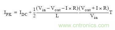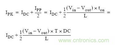 通過上圖我們可以看到,流過電感的最大電流為DC電流加開關(guān)峰峰電流的一半。上圖也稱為紋波電流。根據(jù)上述的公式,我們可以計(jì)算出峰值電流: