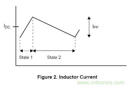 因此,當(dāng)電感上的電壓為正時(shí)(狀態(tài)1),電感上的電流就會(huì)增加;當(dāng)電感上的電壓為負(fù)時(shí)(狀態(tài)2),電感上的電流就會(huì)減小。通過電感的電流如圖2所示:
