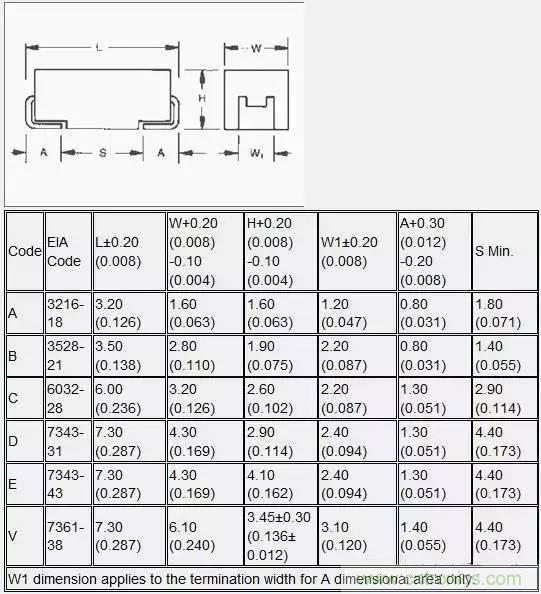 貼片鉭電容封裝、尺寸封裝尺寸:毫米(英寸)