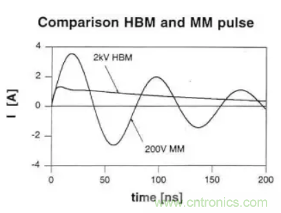 當然就是機器(如robot)移動產生的靜電觸碰芯片時由pin腳釋放,次標準為EIAJ-IC-121 method 20(或者標準EIA/JESD22-A115-A),等效機器電阻為0 (因為金屬),電容依舊為100pF。由于機器是金屬且電阻為0,所以放電時間很短,幾乎是ms或者us之間。但是更重要的問題是,由于等效電阻為0,所以電流很大,所以即使是200V的MM放電也比2kV的HBM放電的危害大。而且機器本身由于有很多導線互相會產生耦合作用,所以電流會隨時間變化而干擾 變化。