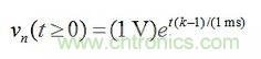 在圖5a的電路中,由vn表示的節(jié)點和地之間的阻抗為Z(s)=R||(1/sC)=R/(1+sRC),因此在s=-1/(RC)=-1/(1ms)時電路具有一個極點。假設vn(0)=1V,我們可以得到: