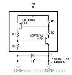 如果器件的數(shù)字輸入和輸出隨時低于DGND,那么從這些輸入或輸出連接到DGND的肖特基二極管將有效地將負偏移鉗位在-0.3V至-0.4V之間。 這可以防止寄生NPN晶體管的發(fā)射極與基極結導通,并且還可以防止SCR觸發(fā)。