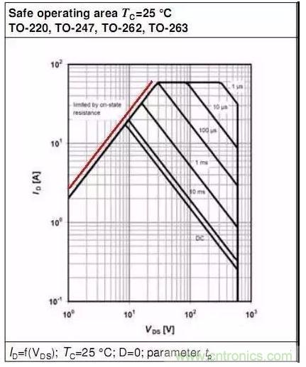 此圖中:當(dāng)VDS=1V時(shí),Y軸對(duì)應(yīng)的ID為2A,Rds=VDS/ID=0.5R ==>Tj=150℃時(shí),Rds(on)約為0.5R.當(dāng)VDS=10V時(shí),Y軸對(duì)應(yīng)的ID為20A,Rds=VDS/ID=0.5R ==>Tj=150℃時(shí),Rds(on)約為0.5R.所以,此部分曲線(xiàn)中,SOA表現(xiàn)為T(mén)j_max時(shí)RDS(on)的限制.