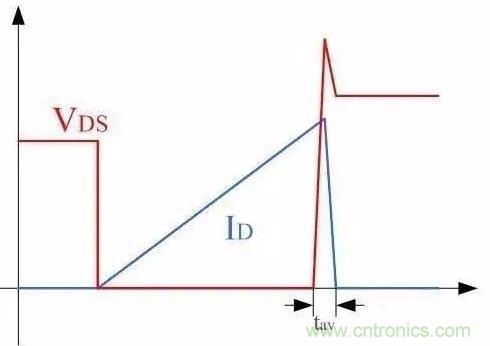 MOSFET雪崩時(shí),波形上一個(gè)顯著的特點(diǎn)是VDS電壓被鉗位,即上圖中VDS有一個(gè)明顯的平臺(tái)