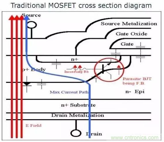 在MOSFET的結(jié)構(gòu)中,實(shí)際上是存在一個(gè)寄生三極管的,如上圖。在MOSFET的設(shè)計(jì)中也會(huì)采取各種措施去讓寄生三極管不起作用,如減小P+Body中的橫向電阻RB。正常情況下,流過(guò)RB的電流很小,寄生三極管的VBE約等于0,三極管是處在關(guān)閉狀態(tài)。雪崩發(fā)生時(shí),如果流過(guò)RB的雪崩電流達(dá)到一定的大小,VBE大于三極管VBE的開(kāi)啟電壓,寄生三極管開(kāi)通,這樣將會(huì)引起MOSFET無(wú)法正常關(guān)斷,從而損壞MOSFET。