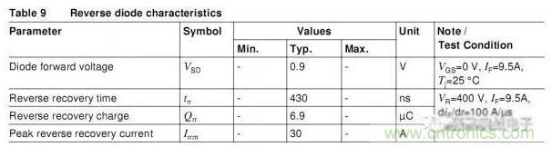 VSD,二極管正向壓降 ==>這個(gè)參數(shù)不是關(guān)注的重點(diǎn),trr,二極管反向回復(fù)時(shí)間 ==>越小越好,Qrr,反向恢復(fù)電荷 ==>Qrr大小關(guān)系到MOSFET的開(kāi)關(guān)損耗,越小越好,trr越小此值也會(huì)小