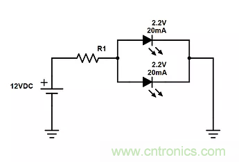 并聯(lián)電路部分是兩個參數(shù)相同的LED并聯(lián)。我們知道在并聯(lián)電路中,總電流等于支路電流之和,因此總電流就為40mA?,F(xiàn)在有足夠的參數(shù)去計(jì)算R1的阻值。LED的壓降為2.2V,因此電阻上的壓降為9.8V。根據(jù)歐姆定律:R = V/I。