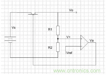 現(xiàn)在我們來看Vo是怎么穩(wěn)定的,假設(shè)Vo變小,那么V+將變小,放大器的輸出Va也將變小,這將導(dǎo)致MOSFET的阻抗變小,這樣經(jīng)過同樣的電流,MOSFET的壓差將變小,于是將Vo上抬來抑制Vo的變小。同理,Vo變大,V+變大,Va變大,MOSFET的阻抗變大,經(jīng)過同樣的電流,MOSFET的壓差變大,于是抑制Vo變大。