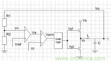 如上圖,為了從高電壓Vs得到Vo,開關(guān)電源采用了用一定占空比的方波Vg1,Vg2推動上下MOS管,Vg1和Vg2是反相的,Vg1為高,Vg2為低;上MOS管打開時,下MOS管關(guān)閉;下MOS管打開時,上MOS管關(guān)閉。由此在L左端形成了一定占空比的方波電壓,電感L和電容C我們可以看作是低通濾波器,因此方波電壓經(jīng)過濾波后就得到了濾波后的穩(wěn)定電壓Vo。Vo經(jīng)過R1、R2分壓后送入第一個放大器(誤差放大器)的負(fù)端V+,誤差放大器的輸出Va做為第二個放大器(PWM放大器)的正端,PWM放大器的輸出Vpwm是一個有一定占空比的方波,經(jīng)過門邏輯電路處理得到兩個反相的方波Vg1、Vg2來控制MOSFET的開關(guān)。