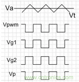 當(dāng)Vo上升時,V+將上升,Va下降,Vpwm占空比下降,經(jīng)過們邏輯之后,Vg1的占空比下降,Vg2的占空比上升,Vp占空比下降,這又導(dǎo)致Vo降低,于是Vo的上升將被抑制。反之亦然。