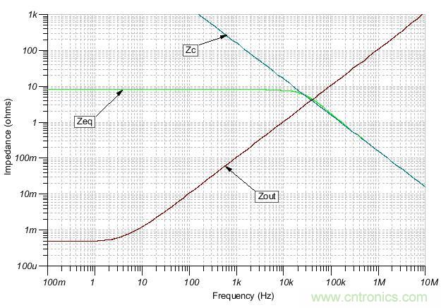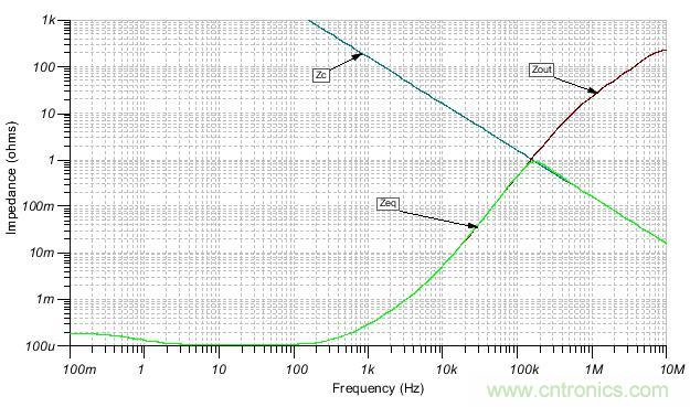 圖3:1-μF電容阻抗、閉環(huán)輸出阻抗和等效閉環(huán)輸出阻抗