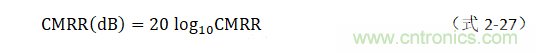 通常Ad值很大,而Ac值趨近于零,所以CMRR很大,數(shù)據(jù)手冊中通常使用dB為單位,計算方式如式2-27。
