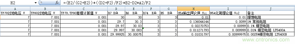 最后,通過Excel生成簡化之前的電路傳遞函數(shù),模擬測試點輸入TP79輸入7V,TP80輸入7.001V,R5、R74保持為理想電阻,分組調(diào)整R6、R7的誤差,計算差分電路標準傳遞函數(shù)的輸出值(Vo1),與計算差分電路化簡之后傳遞函數(shù)的輸出值(Vo2),如圖2.48。