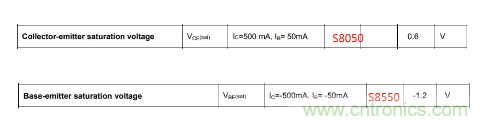 之所以存在功率消耗主要原因是三極管導(dǎo)通、截止存在壓降,從上圖規(guī)格書可以看到S8050壓降為0.5V,S8550壓降為1.2V