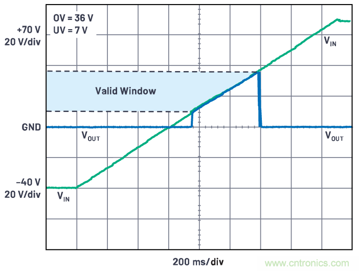 保護(hù)控制器會(huì)監(jiān)測輸入電壓,確保電壓保持在OV/UV引腳的電阻分壓器所配置的電壓范圍內(nèi),當(dāng)輸入電壓超過這個(gè)范圍時(shí),利用背對背MOSFET斷開輸出,如圖9所示。背對背MOSFET也可用于防止反向輸入。輸出端的感應(yīng)電阻通過持續(xù)監(jiān)測正向電流來實(shí)現(xiàn)過流保護(hù),但不需要基于計(jì)時(shí)器的穿越操作。