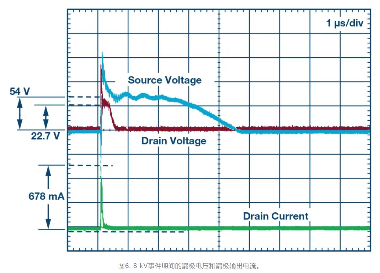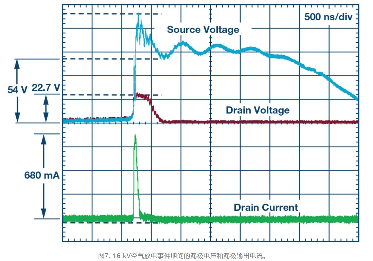 圖6和圖7所示為在8 kV接觸放電和16 kV空氣放電IEC ESD事件在圖5所示測試電路上的測試結果。如前所述,在TVS器件將電壓箝位至54 V左右之前,源引腳上有一個初始過壓。在此過壓過程中,開關漏極上的電壓被箝位于比電源電壓高0.7 V的水平。漏極電流測量結果展示的是流入下游器件二極管中的電流。脈沖峰值電流約為680 mA,電流持續(xù)時間約為60 ns。相比之下,1 kV HBM ESD電擊的峰值電流為660 mA,持續(xù)時間為500 ns。我們因此可以得出結論認為,在采用這種保護電路的條件下,HBM ESD額定值為1 kV的下游器件應該能承受8 kV接觸放電和16 kV空氣放電IEC ESD事件。