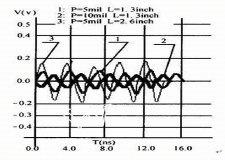 對(duì)于圖1所示的兩線系統(tǒng),我們進(jìn)行了三種情況的仿真(線網(wǎng)AB上的信號(hào)頻率均為100MHz)仿真結(jié)果見(jiàn)表3,及圖6.:第一種情況是在兩線間距和平行長(zhǎng)度不變的條件下,探測(cè)被干擾對(duì)象的串?dāng)_(標(biāo)記“1”);第二種情況是在兩線平行長(zhǎng)度不變的前提下,將兩線間距增加到10mils,然后探測(cè)被干擾對(duì)象的串?dāng)_標(biāo)記“2”;第三種情況是在兩線間距不變的條件下,將兩線的平行長(zhǎng)度增加到2.6inches標(biāo)記“3”,然后探測(cè)被干擾對(duì)象的串?dāng)_。由仿真結(jié)果可見(jiàn),當(dāng)兩線的間距拉大時(shí)(P由5mils變?yōu)?0mils),串?dāng)_明顯地減小了,而當(dāng)兩線的平行長(zhǎng)度加長(zhǎng)時(shí)(L由1.3inches變?yōu)?.6inches),串?dāng)_顯著增大了。