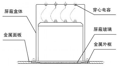 合理布置設(shè)備內(nèi)各單元及元器件的位置,可以做到既經(jīng)濟(jì)又實(shí)用地減小干擾程度。首先必須明確干擾源和受感器,在本設(shè)備中干擾源是控制保護(hù)器,敏感設(shè)備是數(shù)字電流表和電壓表,為了避免二者緊鄰,把它們分別放置于機(jī)箱的后部和前部,用空間距離減弱彼此的電磁干擾。為了達(dá)到更有效的屏蔽效果,又在電流、電壓表的表體外圍罩有屏蔽盒,表頭緊貼前面板的屏蔽玻璃,玻璃的絲網(wǎng)毛邊通過(guò)螺裝金屬外框?qū)⑺蜋C(jī)箱、屏蔽盒聯(lián)成一體,從而使表體完全處于電氣連續(xù)的金屬罩中( 如圖1 所示) ,而電流、電壓表引線則由裝在屏蔽盒上的穿心電容引入,這樣使引線所感應(yīng)的干擾信號(hào)被旁路接地。同樣控制保護(hù)器也用屏蔽盒對(duì)其進(jìn)行了屏蔽,進(jìn)一步減小了它對(duì)外的輻射能量,從而獲得較好的屏蔽效果。