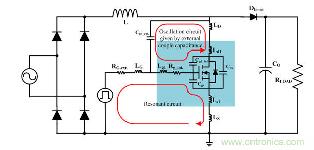 圖2.包含功率MOSFET內(nèi)外部寄生元件的PFC電路簡(jiǎn)圖