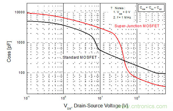 圖1. 平面型MOSFET和超級(jí)結(jié)MOSFET輸出電容的比較