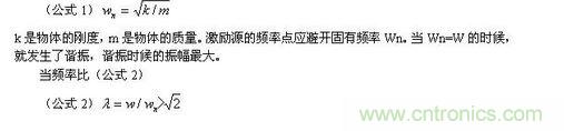 頻率可分為固有頻率Wn和激勵頻率W,固有頻率源于產(chǎn)品的結構特征,由質量、質量分布、質心位置、剛度等多個因素和多個因素間的相互作用所確定。固有頻率計算公式為(公式1)k是物體的剛度,m是物體的質量。激勵源的頻率點應避開固有頻率Wn。當Wn=W的時候,就發(fā)生了諧振,諧振時候的振幅最大。
