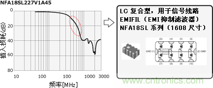信號頻率為12MHz,同去除噪音所必須的頻帶700MHz相比頻率較低,為了接近信號頻率通過所必須的頻帶 (~100MHz) ,選擇了插入損耗曲線變化急劇,對信號頻率和噪音頻率選擇度較高的LC復(fù)合型EMI濾波器。因?yàn)樾盘柧€路很多,所以EMI濾波器為排容型NFA18SL系 列。在檢查靜噪效果和信號質(zhì)量之間平衡的同時,我們選擇了220MHz的截止頻率。
