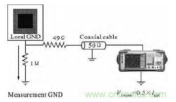 在測試時,需要在進行測試的電路中接入串聯(lián)電阻 為1Ω的電流探針(探針即為1Ω測試網(wǎng)絡(luò),已經(jīng)集成在EMC測試板的芯片地端與PCB地平面之間),49Ω串聯(lián)放置為了形成50Ω匹配,用接收機測量射頻 電流流經(jīng)該電阻時產(chǎn)生的射頻電壓,所測得的電壓應(yīng)為所有流回到集成電路的射頻電流在電流探頭上產(chǎn)生電壓的總和,測得的電壓值可以換算為流過探針的電流,測 試環(huán)境圖如圖1所示。