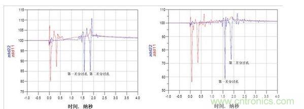 圖3:TDR阻抗波特圖(左:使用背面鉆孔,ZDIFF大約為85Ω;右:無背面鉆孔,ZDIFF大約為58Ω)