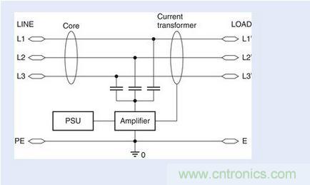 放大器饋入電流至每相中,其相位角偏移至初始漏地電流的相位角180°。放大器的電源單元 (PSU) 直接從3相 電網(wǎng)中 獲取,因 此無需額外電源。