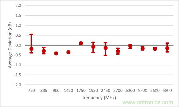 cSAR3D和DASY6用flat 的模型來做的校正結果比對如下圖四,使用了超過490種頻率組合來測量(從750到2450 MHz),并且用了兩種不同能量源。和各式各樣的模塊(CW, WiFi, Bluetooth, LTE-FDD and LTE-TDD),天線擺放位置、旋轉天線角度(0°,25°,45°,67.5°和90°)來和不同的量測距離來進行比對測試數(shù)據(jù)。在每個頻率下計算對比結果的平均誤差和標準偏差。