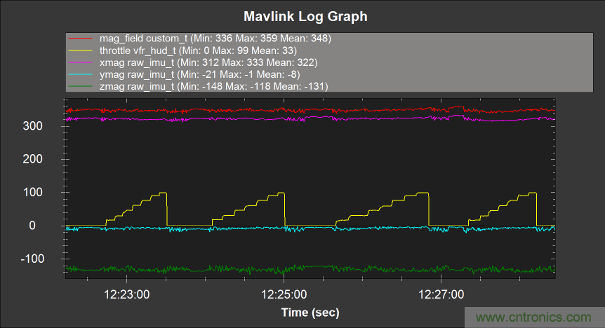 測(cè)試過(guò)程中,只需將油門從關(guān)閉調(diào)整到開(kāi)啟狀態(tài)并逐級(jí)推進(jìn),進(jìn)行幾輪反復(fù)測(cè)試,最終將幾輪測(cè)試的數(shù)據(jù)匯總到同一時(shí)間軸上進(jìn)行展現(xiàn)。由于無(wú)人機(jī)已經(jīng)被固定住,并沒(méi)有出現(xiàn)方位的移動(dòng),因此理論上無(wú)論油門如何調(diào)整,X、Y、Z各軸磁場(chǎng)的數(shù)字應(yīng)變化不大,呈現(xiàn)出區(qū)域平穩(wěn)的態(tài)勢(shì)。但實(shí)際上,由于電子羅盤組件本身及系統(tǒng)都會(huì)有噪聲,因此數(shù)據(jù)線條會(huì)有一定程度的上下抖動(dòng),但趨勢(shì)應(yīng)是不變的,抖動(dòng)的幅度越小,意味著移動(dòng)路線越穩(wěn)定。