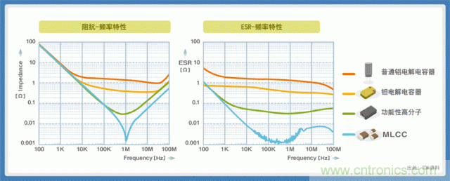 ESR越小的電容器,能夠?qū)⒉y電壓抑制到更小。如下述圖表所示,MLCC的特點(diǎn)在于ESR極小,僅為數(shù)mmΩ左右。因此,使用MLCC更換電解電容器將能夠發(fā)揮極佳的表現(xiàn)。