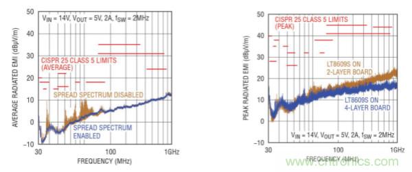 圖 7:(a) 采用一塊兩層電路板的 LT8609S 之平均輻射 EMI 測試結(jié)果顯示了在啟用擴展頻譜頻率調(diào)制功能時以進一步降低 EMI 的情況。(b) 裝有 LT8609S 的兩層和四層電路板的峰值輻射 EMI 性能比較。