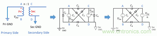 由于繞組電壓的線性關(guān)系,通過推導(dǎo)可得出,僅用一個電壓源以及兩個等效電容即可表征它的共模特性。電壓源即為原邊繞組上的電壓,而兩個等效電容的和是變壓器原副邊之間的總電容,它們分別表示產(chǎn)生和不產(chǎn)生共模電流的電容。
