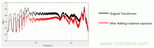 Fig. 7. 跨接補(bǔ)償電容前后的共模噪聲比較