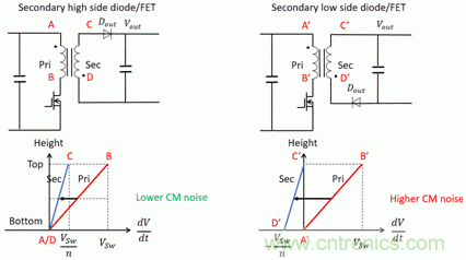 Fig.12. 副邊二極管(或同步整流管)在高、低側(cè)的繞組dv/dt示意圖