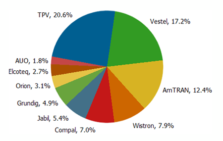 從代工廠商排名來看,TPV主要客戶有Vizio、AOC以及Philips,第一季市占率為20.6%排名居首;Vestel以17.2%市占率居次,而其主要生產(chǎn)供貨給自有品牌、白牌業(yè)者以及賣場品牌機種;第三名代工廠商為AmTRAN,第一季市占率12.4%,該公司主要客戶為Vizio。同時隨著中國液晶電視出貨對全球液晶電視市場日益重要,以及國內(nèi)品牌廠商市占率超過海外品牌廠商,DisplaySearch在每季度報告中均包括有中國電視廠商供應(yīng)鏈的詳細(xì)分析,對關(guān)心中國市場的客戶是一份相當(dāng)值得參考的資料。