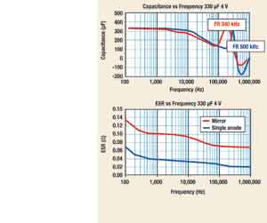 鏡像結(jié)構(gòu)如果使用更薄的陽極,電容將隨頻率下降至更低。鏡像設(shè)計的共振頻率改變,其原因是目前一般的DC/DC轉(zhuǎn)換器其開關(guān)頻率的工作范圍(250~500kH)會因降低ESL而顯著升高。