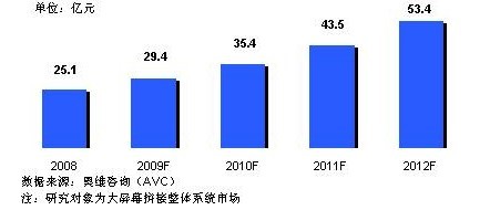 屏幕拼接市場(chǎng)已經(jīng)進(jìn)入快速成長(zhǎng)期,據(jù)奧維咨詢(xún)(AVC)《中國(guó)大屏幕拼接市場(chǎng)研究報(bào)告》顯示,2008年中國(guó)市場(chǎng)規(guī)模約為25.1億元,2009年雖然遭遇經(jīng)濟(jì)大環(huán)境的影響,預(yù)計(jì)仍將增長(zhǎng)17%左右,市場(chǎng)規(guī)模將達(dá)29.4億元。市場(chǎng)的成長(zhǎng)主要得益于國(guó)家對(duì)能源、交通等基礎(chǔ)建設(shè)的大規(guī)模投入,以及09年全運(yùn)會(huì)、10年世博會(huì)、亞運(yùn)會(huì)等大型賽會(huì)事的拉動(dòng)。