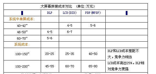 從總體系統(tǒng)分析,100-150”系統(tǒng)中,DLP平均成本為20~25萬(wàn)元左右,而LCD和DLP的差距已經(jīng)縮小到10萬(wàn)元以?xún)?nèi),成本競(jìng)爭(zhēng)力基本相當(dāng)。在150”以上超大拼接系統(tǒng)中,LCD的成本要高出DLP大約25-30%,而MPDP更是要高出30%以上,這一領(lǐng)域DLP的成本競(jìng)爭(zhēng)力優(yōu)勢(shì)比較明顯。