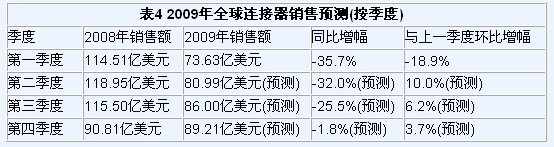 業(yè)界一致的看法是2009年連接器銷售額將下降25%左右。假定在今年后三個季度內(nèi),行業(yè)實(shí)現(xiàn)環(huán)比增長,則預(yù)測如果如表4所示。如此推算,世界連接器市場需到2009年第四季度或2010年第一季度才能再實(shí)現(xiàn)年度同比增長。