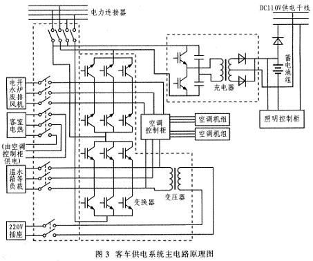 DC600V空調客車供電系統(tǒng)采用機車集中整流,客車分散逆變方式,構成了整個列車的交一直一交變流供電系統(tǒng)。工作過程為:電力機車將25kV電網(wǎng)單相交流電降壓、整流、濾波成DC600V后給客車供電,客車根據(jù)用電設備的需要,將機車提供的DC600V變換成單、三相交流電及DC110V。系統(tǒng)采用兩套獨立供電。具有一定的冗余,客車供電的基本原理圖如圖3所示。