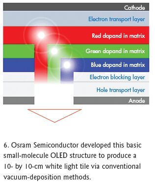 成員之一的歐司朗半導(dǎo)體公司去年展示了一款10×10cm的OLED面板,它在1000cd/m2條件下,具有30至50lm/W的光輸出,壽命為5000小時(shí)。在歐司朗這一工作的中間環(huán)節(jié),還證明了OLED的白光輸出能比以前取得的較低水平有提高。歐司朗采用的是基本的真空沉積技術(shù),使用的是小分子而不是可打印聚合物(圖6)。歸功于與BASF AG的合作,該面板的光輸出后增至60lms/W。