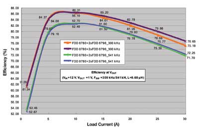 注意上面的兩條曲線,在滿載(30A)時(shí),可以看到最新的器件的效率有1.5%的改進(jìn)。同樣還是這兩條曲線,在負(fù)荷較?。?5A)時(shí),可以實(shí)現(xiàn)0.69%的改善。如果對(duì)整個(gè)負(fù)荷范圍積分,那么與今天常見的方案相比,使用最新的MOSFET器件時(shí)平均功率損耗可以降低8%~10%。即使在較高的開關(guān)頻率541kHz處,可以看到在負(fù)荷小時(shí)系統(tǒng)級(jí)效率仍然高于80%,而在滿載時(shí)效率大于70%。如果頻率繼續(xù)增加,那么開關(guān)損耗將急劇增加。